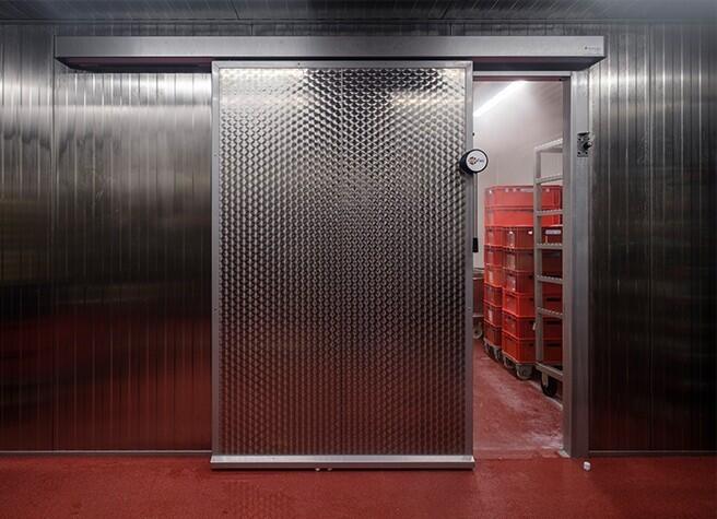 Schuivende koeldeur geschikt voor een voedselveilige omgeving